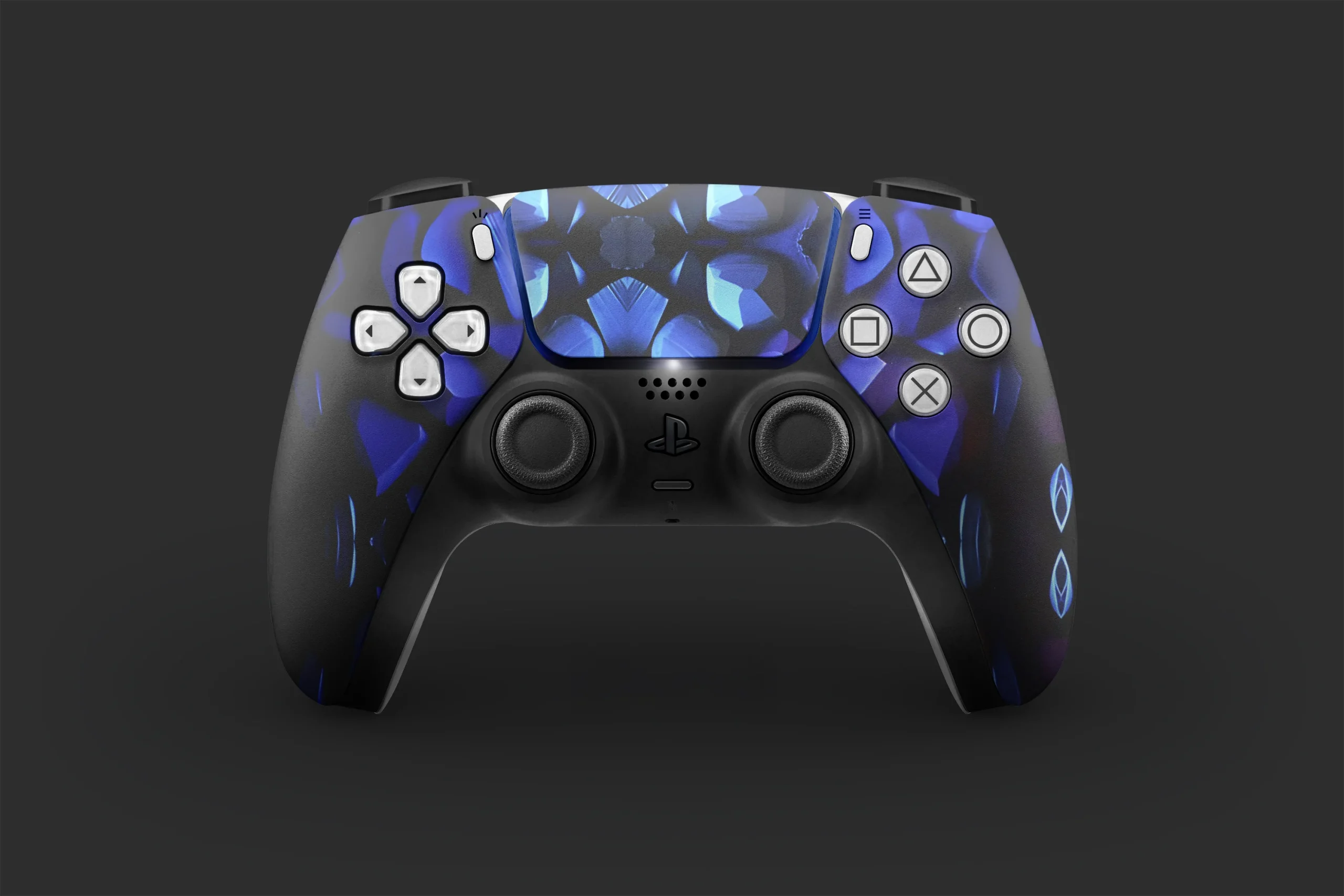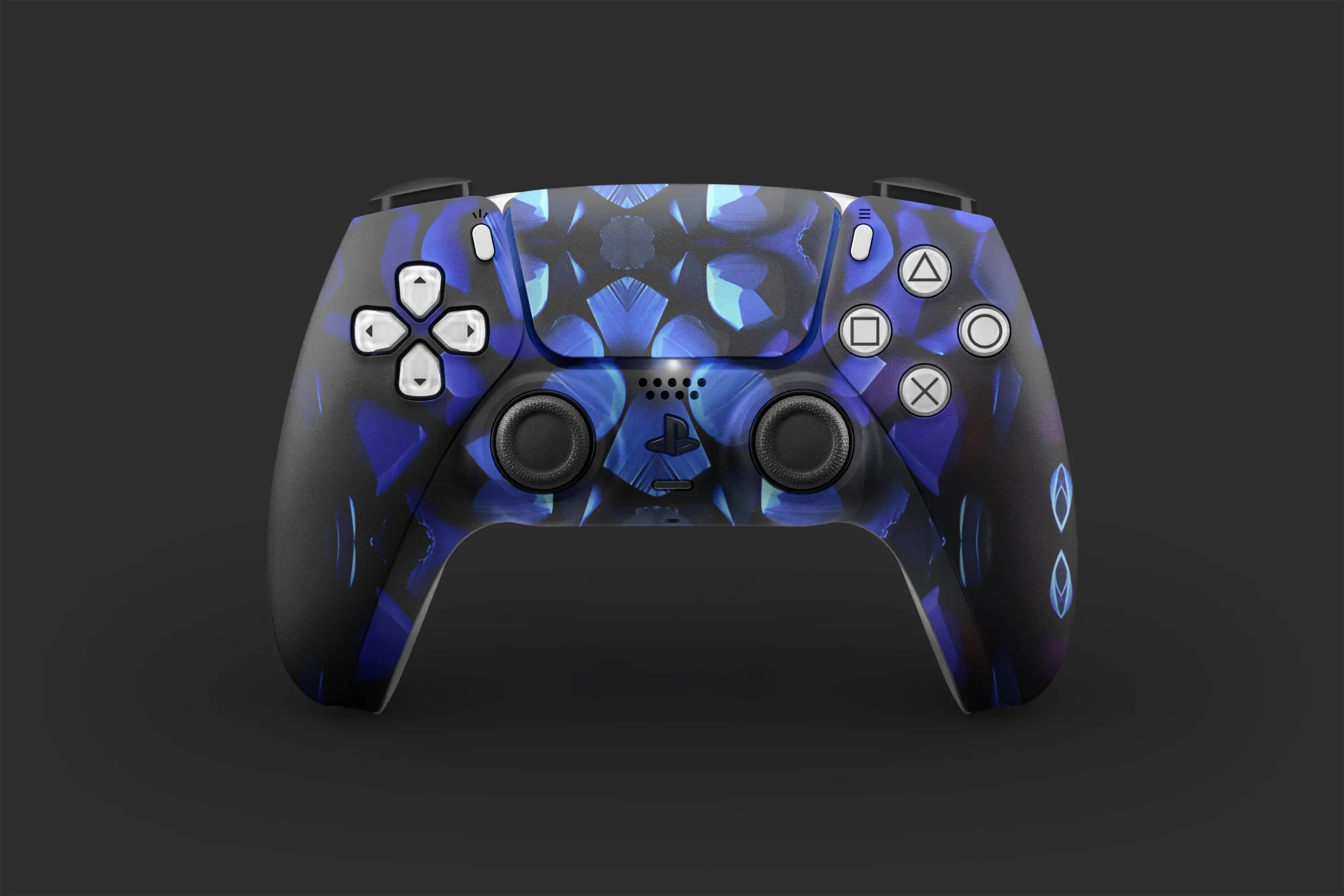 Striking PS5 controller skin with kaleidoscopic blue geometric patterns, giving a modern, digital art vibe. Durable installation protects against scratches, while the bold blue hues add a unique flair to your gaming setup. More Skins