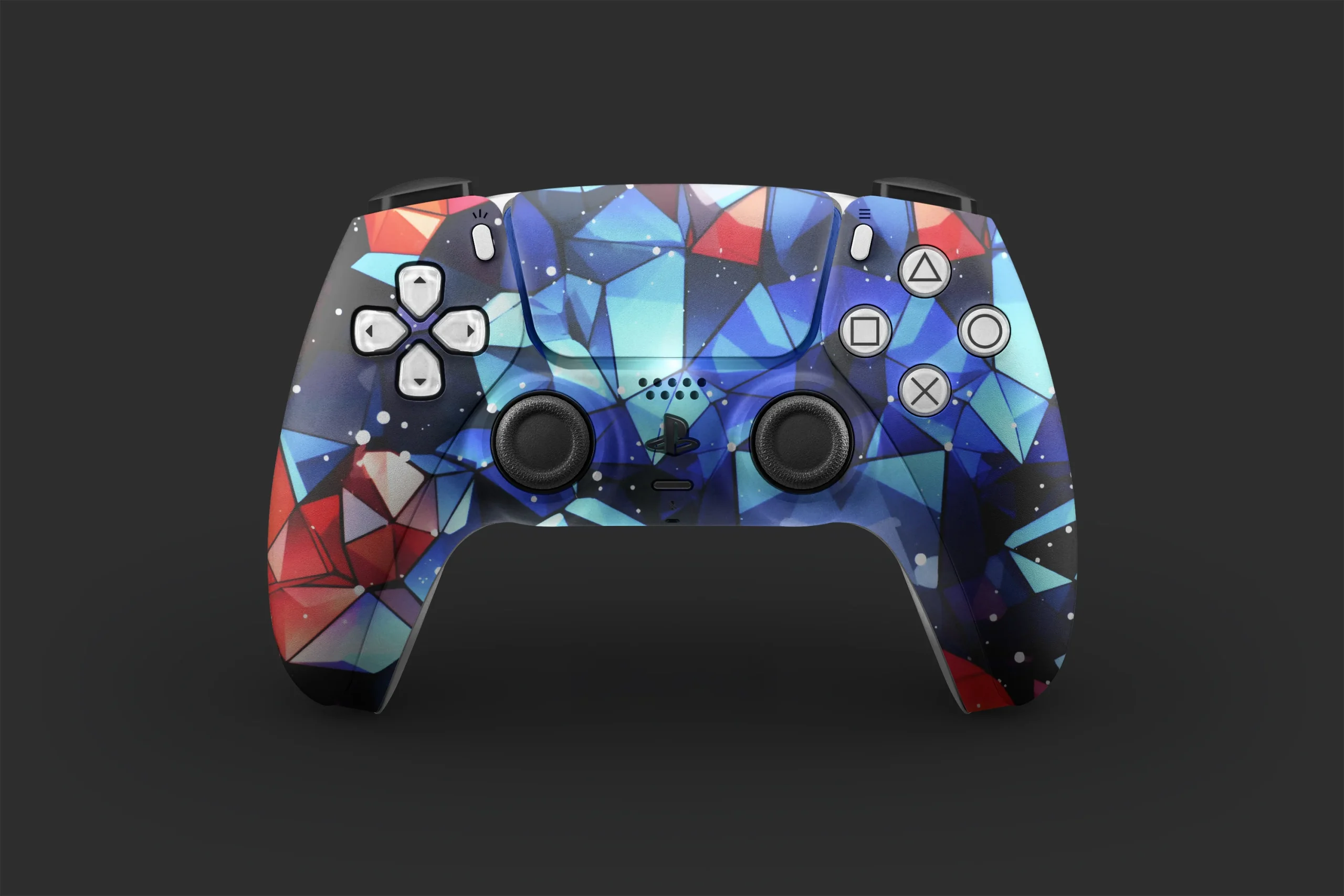 Striking geometric PS5 controller skin featuring blue, teal, and red crystal polygons with a starry overlay. Durable and easy to apply, this angular design provides premium scratch protection and a unique, energetic look for any setup. More Skins Crystal Geometry Ps5 Controller Skins.