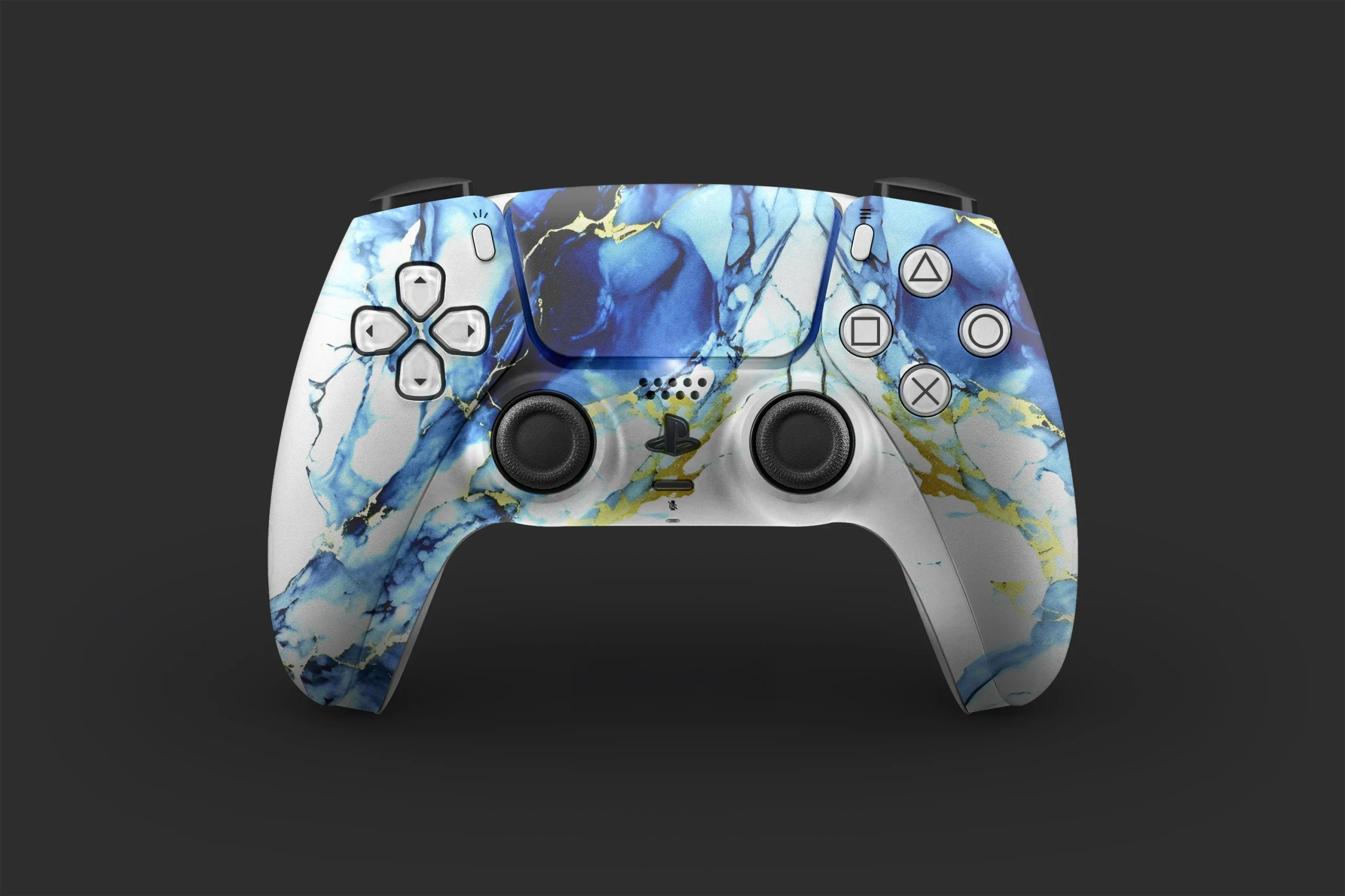 Premium Blue Marble PS5 controller skin featuring vivid blue and gold marble accents, designed for a sleek look and comfortable grip. Protects your Controller from scratches and everyday wear with easy, bubble-free installation and residue-free removal. More Skins Golden Blue Marble Wrap for PS5 Controller