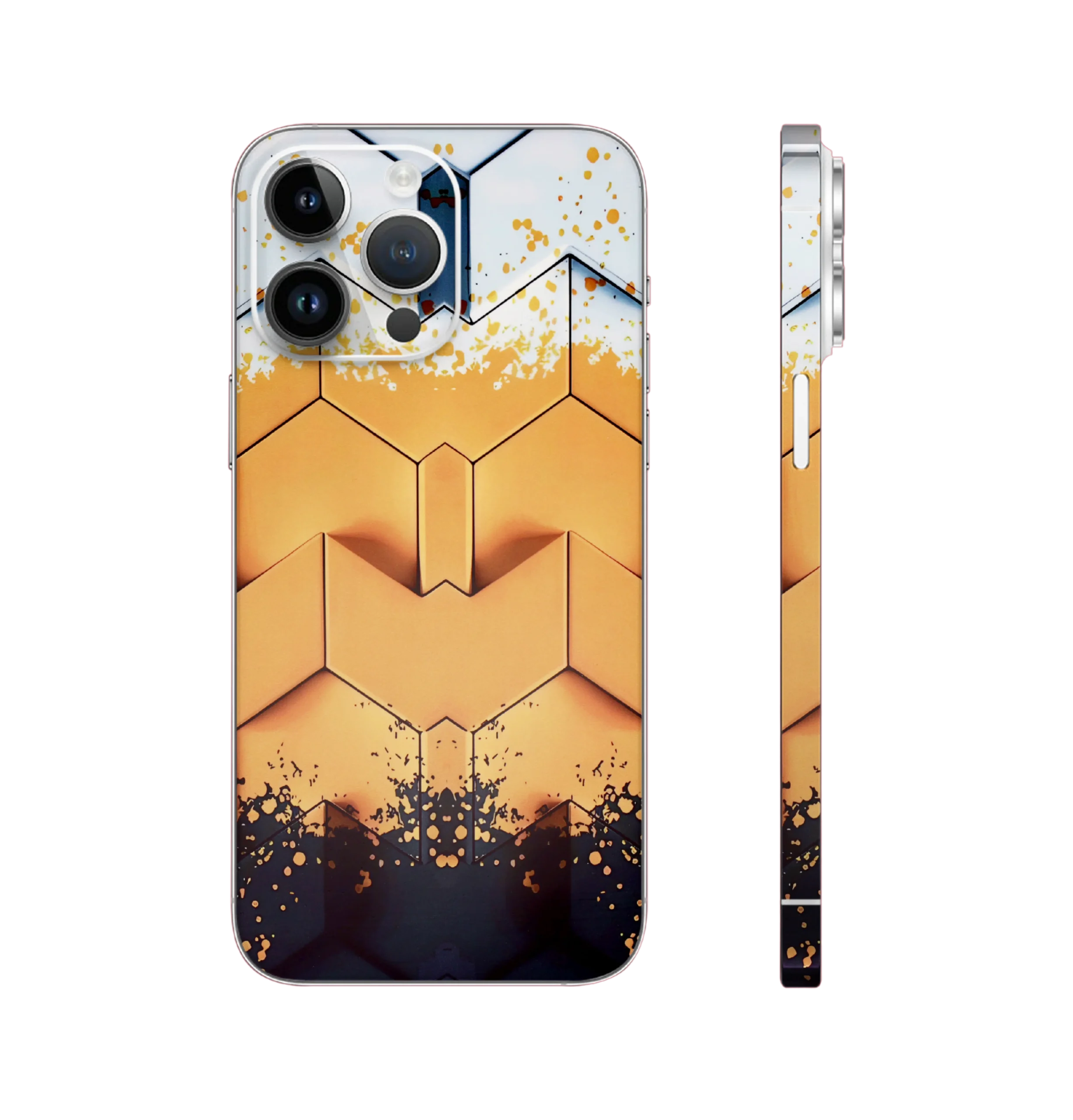 Stand out with this gold 3D honeycomb phone skin, featuring a bold geometric hexagon design and black splatter accents for a modern, edgy look. Precision-cut for a perfect fit, it protects while adding style. Crafted with precision-fit vinyl, each wrap offers scratch protection without adding bulk. Golden Honeycomb Geometric Phone Skin