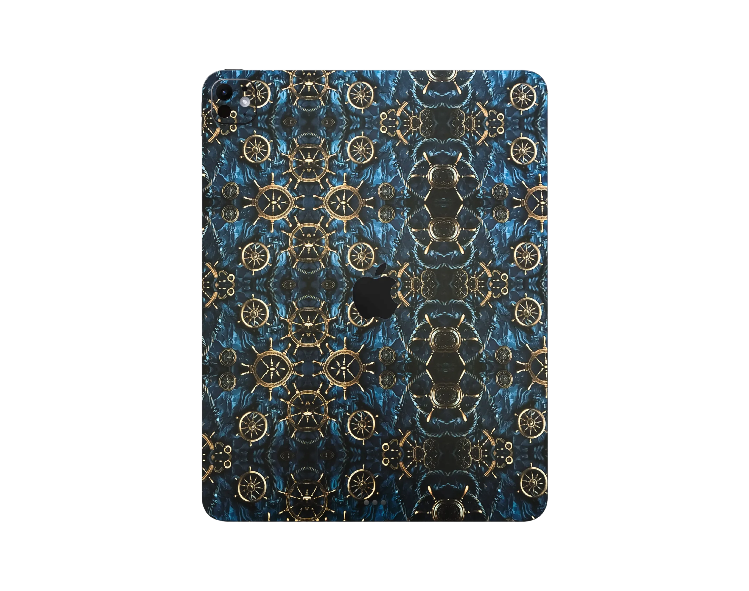 “Give your iPad or tablet a bold ocean-inspired upgrade with our Nautical Skin. Featuring golden ship wheels over a deep blue background, this design adds a touch of adventure, style, and premium protection.