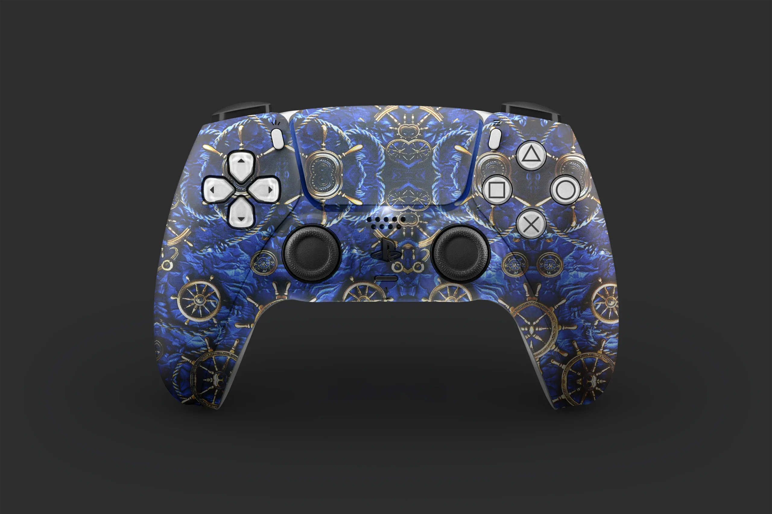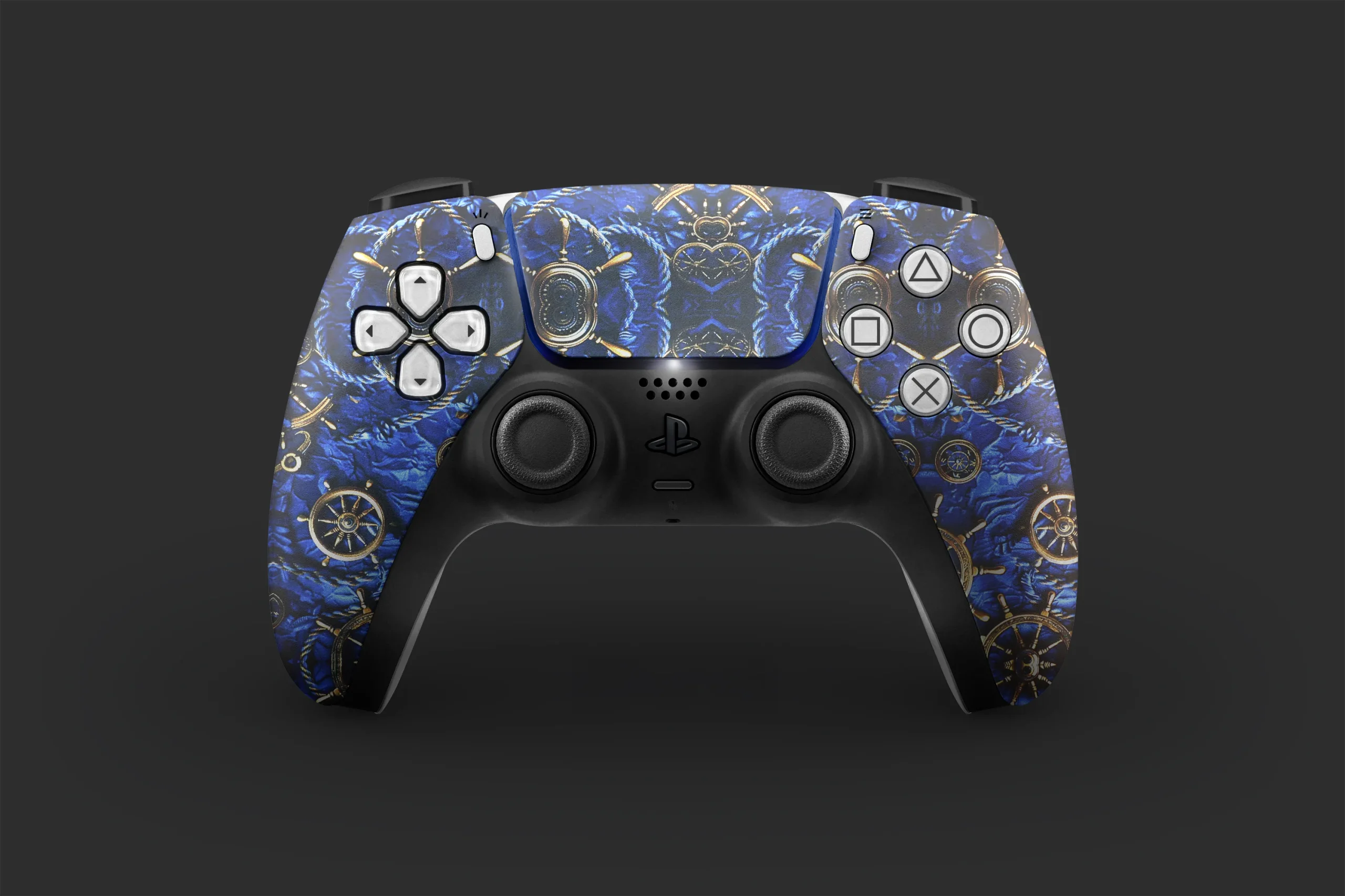 Premium PS5 controller skin featuring nautical ship wheels and deep ocean blues, delivering a bold maritime vibe with gold accents. Scratch-resistant and easy to apply, this design is perfect for gamers who love classic nautical aesthetics. Mobile skin Nautical Wheel Ps5 Controller Skin.