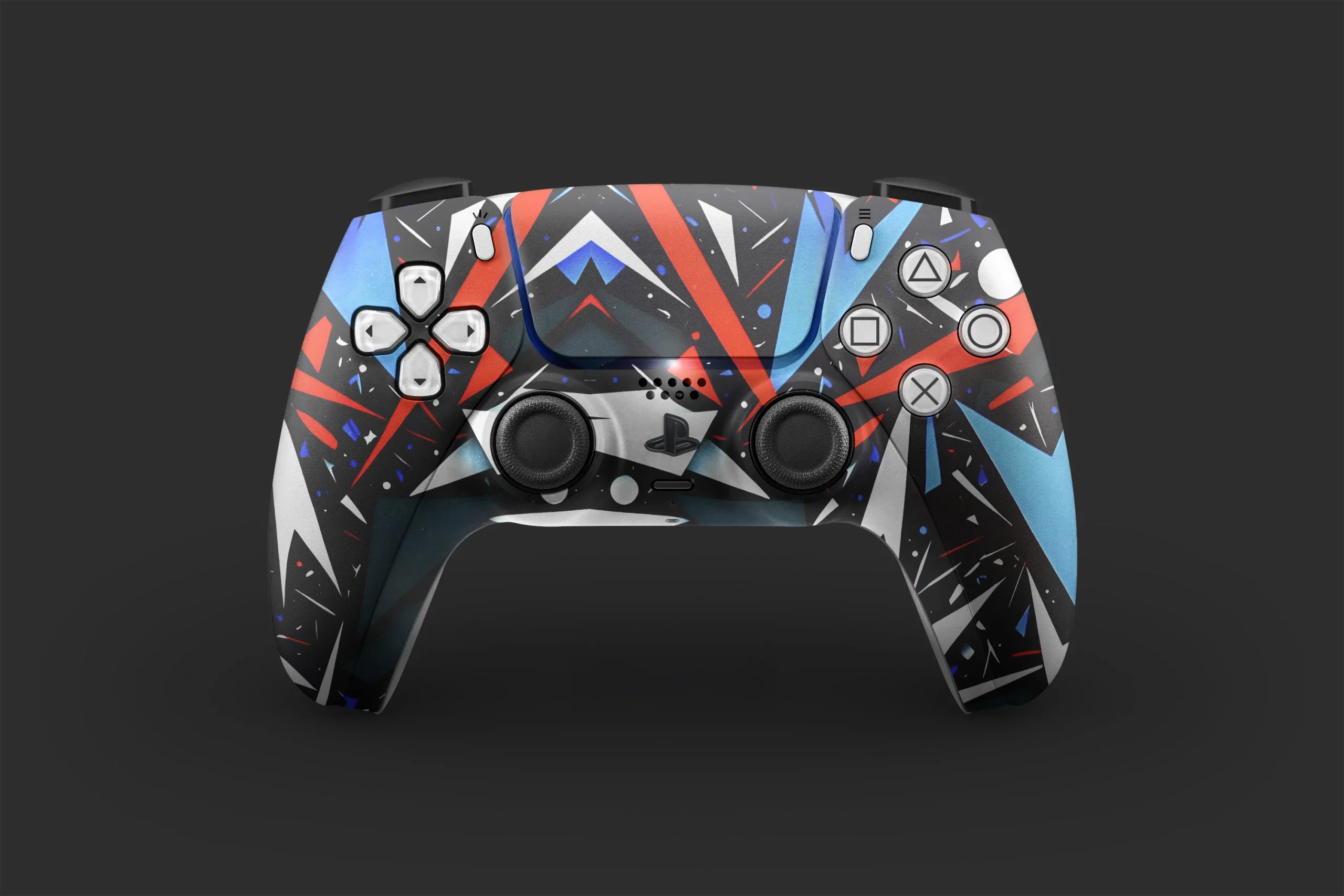 Striking geometric PS5 controller skin in bold red, blue, white, and black, featuring sharp lines and abstract shapes for an energetic modern look. Provides full protection, bubble-free install, and a unique statement for any gaming setup.