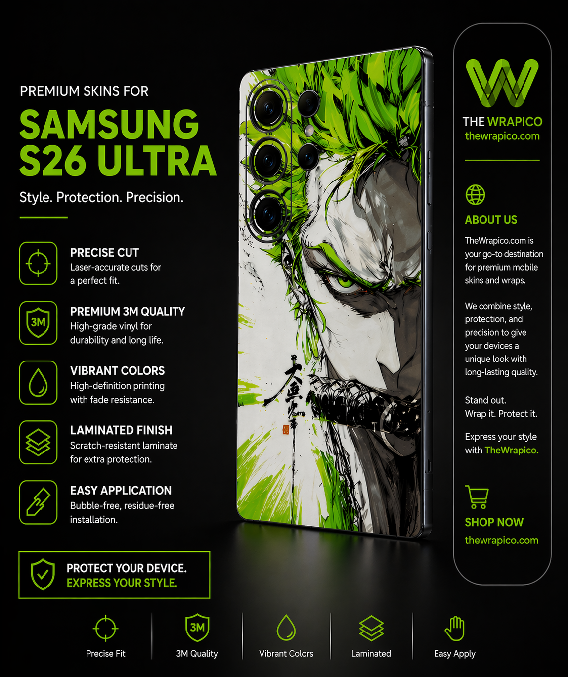 Inspired by bold anime artwork, this Samsung skin wrap transforms your phone into a unique statement piece while maintaining its slim profile. The laser-cut precision ensures a perfect fit for models like Samsung S26 Ultra, S25 Ultra, S24 Ultra, and more, without interfering with buttons or ports.